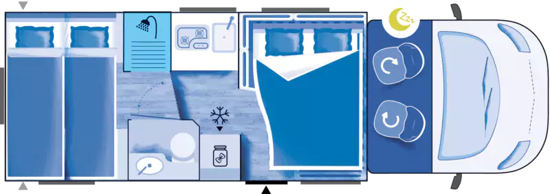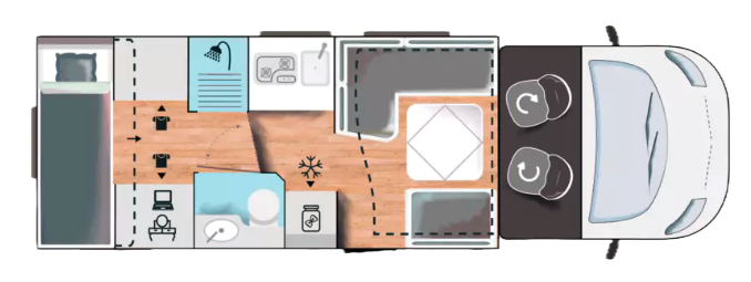Tento obytný vůz se nepodobá ničemu jinému na trhu a je navržen tak, aby byl vhodný pro rodiny s dětmi a pro práci na dálku: Modulární lůžka + kancelářský prostor. Vhodný pro čtyři osoby.